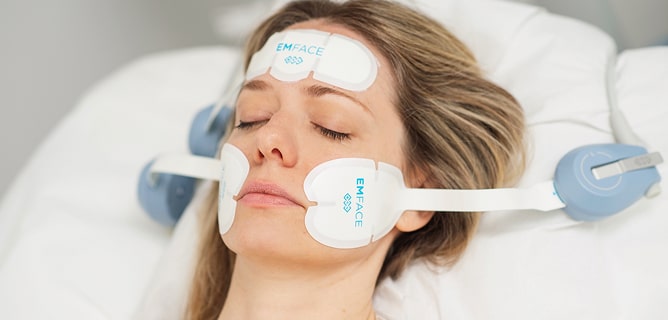 Emface uses a patented combination of Synchronized Radiofrequency heating to stimulate collagen and elastin production and the HIFES facial muscle stimulation to contract and restore the facial muscles. The result is a visibly lifted, firmer, and more youthful-looking face — all without needles or downtime.